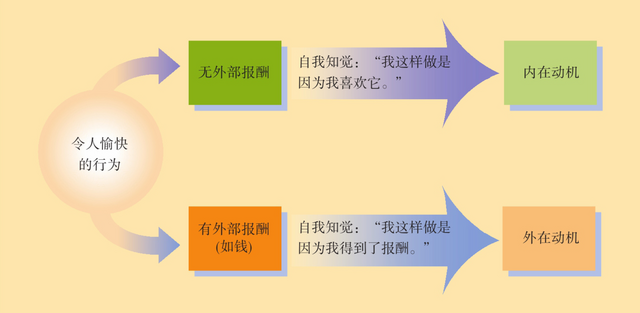 当人们在没有报酬或没有强迫的情况下做自己喜欢的事情时,他们会将自己的行为归因于对这种活动的兴趣。而外部报酬引导人们将自己的行为归因于激励性因素,从而破坏了内在动机。