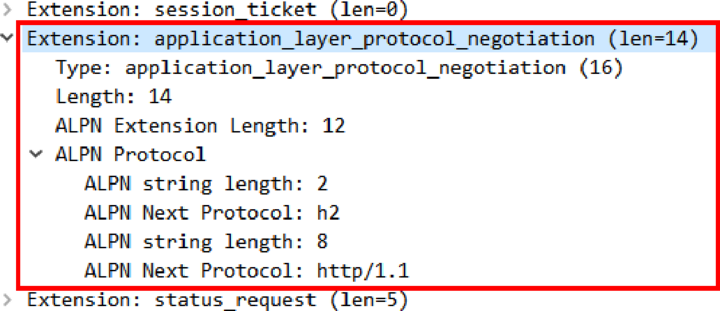 客户端在发起“Client Hello”握手的时候,后面会带上一个“ALPN”扩展,里面按照优先顺序列出客户端支持的应用协议。