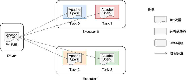 在使用广播变量之前,list 变量的分发是以 Task 为粒度的,而在使用广播变量之后,变量分发的粒度变成了以 Executors 为单位,同一个 Executor 内多个不同的 Tasks 只需访问同一份数据拷贝即可。换句话说,变量在网络中分发与存储的次数,从 RDD 的分区数量,锐减到了集群中 Executors 的个数。