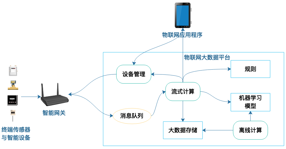 这样就构成一个典型的物联网“端 - 云 - 端”架构,其中两个端分别是传感器与智能设备端,以及应用程序设备端,而云则是大数据云计算平台。