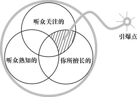 图中“听众关注的”和“你所擅长的”这两个环相交的阴影部分就是你的“导火索”。它是听众关注而又不熟知,同时又是你擅长讲授的内容。比如,在新冠肺炎疫情期间,大家都很关注疫情防护知识,但是,关于“如何戴口罩”“如何用酒精消毒”这些都已经被大众所熟知了。你需要讲点儿新的干货,才能吸引听众的兴趣,比如你可以讲讲“如何提升自身免疫力”等。