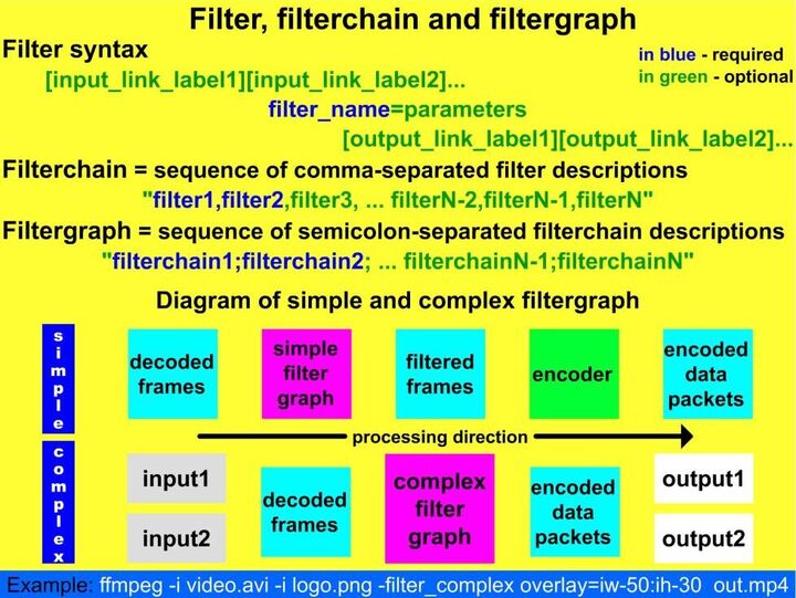 Filter, filterchain and filtergraph(ffmpeg) January 7, 2024 Content # If any spaces are used, the filterchain must be enclosed in quotes. From # FFmpeg Basics Links # Link labels in filterchains and filtergraphs