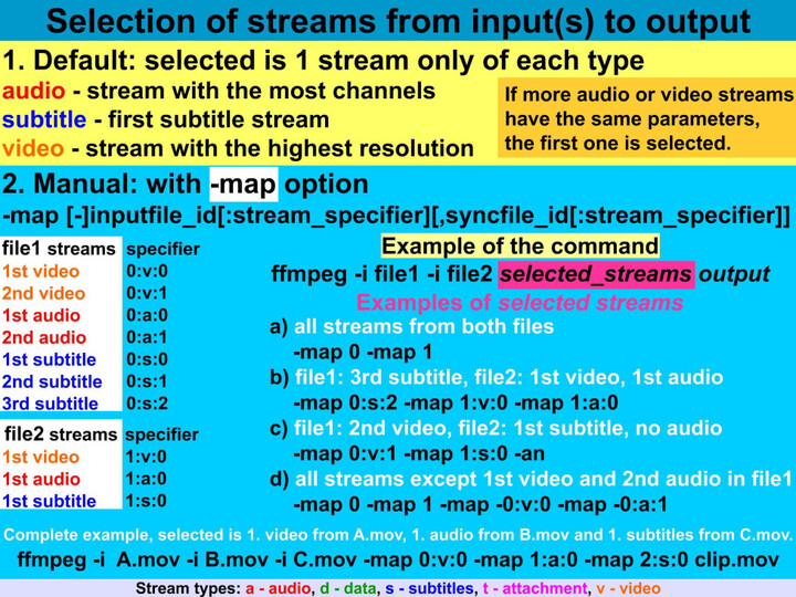 文件和流和下标都是从0开始算。不使用-map,则每种类型(audio, video, subtitle)只会选出一个流。 There are some special stream specifiers: