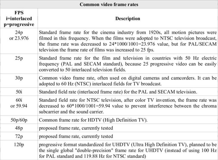 Progressive frame rates of 24p, 25p and 30p are used in the film industry. Newer frame frequency 50p/60p is used in the high-end HDTV products.