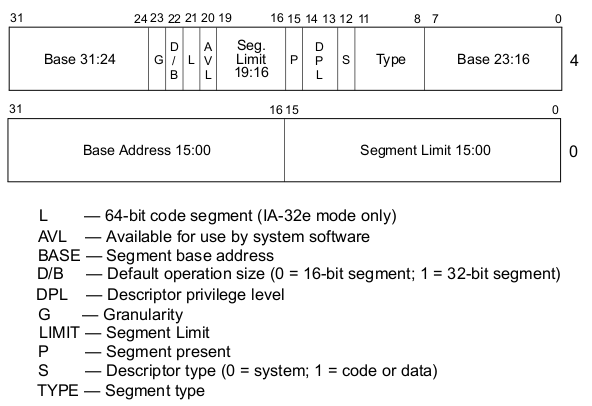 用于指示该段是否在存在于内存当中。若P位为0,操作系统可将使用下图中标识为Available的位置,比如用来存放加载该段所需的信息。