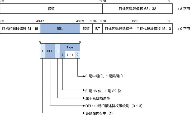 首先为了支持 64 位寻址中断门描述符在原有基础上增加 8 字节,用于存放目标段偏移的高 32 位值。其次,目标代码段选择子对应的代码段描述符必须是 64 位的代码段。最后其中的 IST 是 64 位 TSS 中的 IST 指针,因为我们不使用这个特性,所以不作详细介绍。