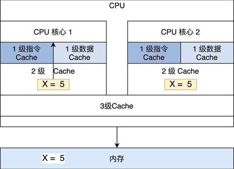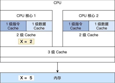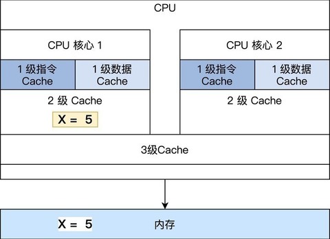 - S 共享(Shared):当前 Cache 中的内容有效,Cache 中的数据与内存中的数据一致,数据在多个 CPU 核心中的 Cache 里面存在。例如在 CPU 核心 1、 CPU 核心 2 里面 Cache 中的 X=5,而内存中也是 X=5 保持一致。