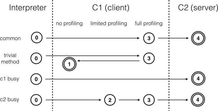 这里我列举了 4 个不同的编译路径(Igor 的演讲列举了更多的编译路径)。通常情况下,热点方法会被 3 层的 C1 编译,然后再被 4 层的 C2 编译。