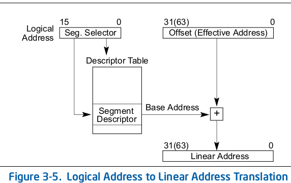 逻辑地址由两部分组成: 16位的段选择符(segment selector)和32位的位移(offset)。