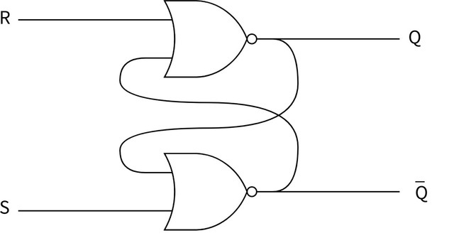 上图中的电路由两个或非门组成,它的特点是,图上方的或非门的输出作为图下方的或非门的输入,反过来,图下方的或非门的输出,也是图上方的或非门的输入。我来分析一下这个电路的特点,你就能理解这个电路是如何完成一个比特的存储的。