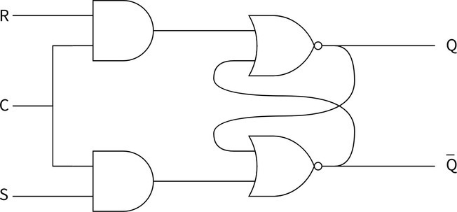 如下图所示,通过增加两个与门来实现保持位 C。当保持位为 1 时,RS 锁存器的功能与不加保持位时完全相同,当保持位为 0 时,则 R 端和 S 端不论取什么值,都不再起作用了。