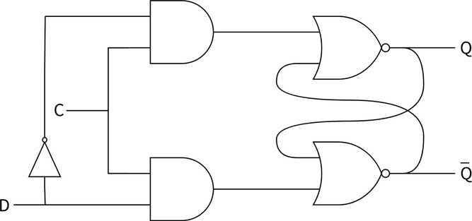 我们再对上图进行更深一步的分析,R 和 S 同时为 0 的情况,可以使用保持位为 0 来代替。R 和 S 同时为 1 的情况是非法情况,所以我们可以使用一个非门,把 R 和 S 合并成一个信号 D,这样的话,电路的输入端就可以进一步化简,如下图所示: