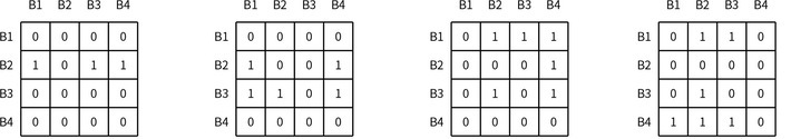 假设现在一个四路相连的缓存组包含数据块 B1、B2、B3、B4, 数据块的访问顺序为 B2、B3、B1、B4,那么 LRU 矩阵在每次访问后的变化如下图所示: