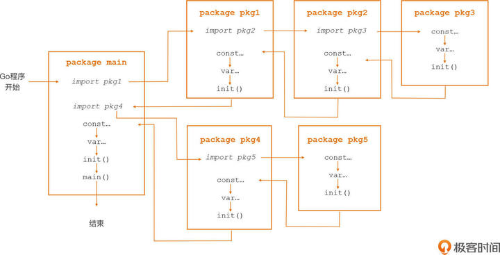 包的初始化次序 July 19, 2022 包的初始化次序 # 我们就通过一张流程图,来了解学习下 Go 包的初始化次序: 只需要记住这三点就可以了: 依赖包按“深度优先”的次序进行初始化; 每个包内按以“常量 -> 变量 -> init 函数”的顺序进行初始化; 包内的多个 init 函数按出现次序进行自动调用。 Viewpoint # From # Links #