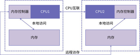 如上图所示,连接到 CPU1 的内存控制器的内存被认为是本地内存。连接到另一个 CPU 插槽 (CPU2) 的内存被视为 CPU1 的外部或远程内存。远程内存访问比本地内存访问有额外的延迟开销,因为它必须遍历互连(点对点链接)并连接到远程内存控制器。由于两者内存位置不同,访问方式也不同,因此这种系统会经历“不均匀”的内存访问时间。