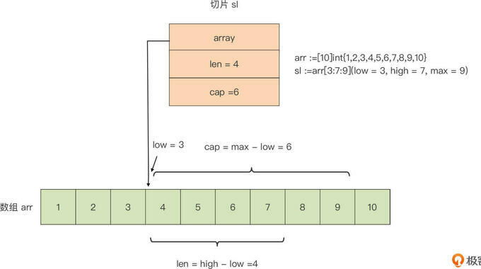 我们看到,基于数组创建的切片,它的起始元素从 low 所标识的下标值开始,切片的长度(len)是 high - low,它的容量是 max - low。而且,由于切片