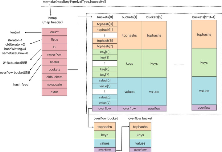这是 map 类型在 Go 运行时层实现的示意图: