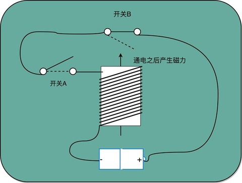 在下面这张图里你可以看到,我们在原先一般只放一个开关的信号输入端,放上了两个开关。一个开关 A,一开始是断开的,由我们手工控制;另外一个开关 B,一开始是合上的,磁性线圈对准一开始就合上的开关 B。