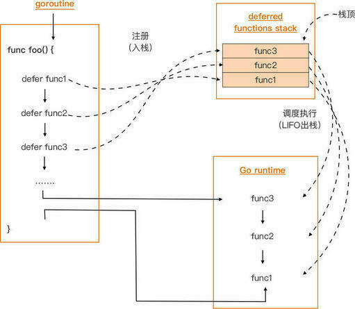 defer 将它们注册到其所在 Goroutine 中,用于存放 deferred 函数的栈数据结构中,这些 deferred 函数将在执行 defer 的函数退出前,按后进先出(LIFO)的顺序被程序调度执行(如下图所示)。
