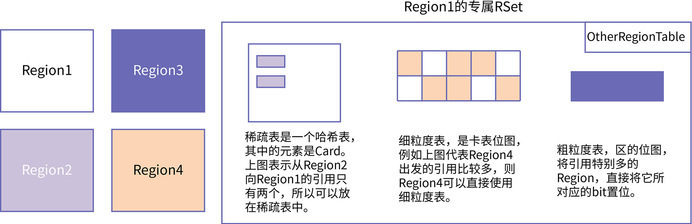 总之,随着其他 Region 对本 Region 的引用关系越多,RSet 存放引用关系使用的表粒度就越粗,这样做主要是为了减少 RSet 记录数,提高定位效率。