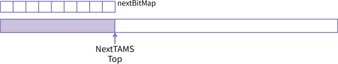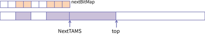 随着业务线程的执行,top 指针不断向后移动。并发标记开始时,nextTAMS 记录下当前的 top 指针,并且针对 nextTAMS 之前的对象进行活跃性扫描,扫描的结果就存放在 nextBitMap 中。