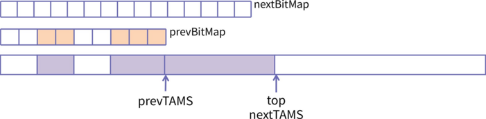 我们再从对象活跃性的角度理解两个 TAMS 指针和 top 的关系。当并发标记开始时,nextTAMS 就固定了,但是 top 还是可能继续向后移,所以 nextTAMS 和 top 之间的对象在这次标记过程中都被认为是活跃对象。当 Evacuation 开始时,它只使用 prevBitMap 的信息,显然 prevBitMap 中的信息只能覆盖到 prevTAMS 处,所以从 prevTAMS 到 top 的对象就都认为是活跃的。