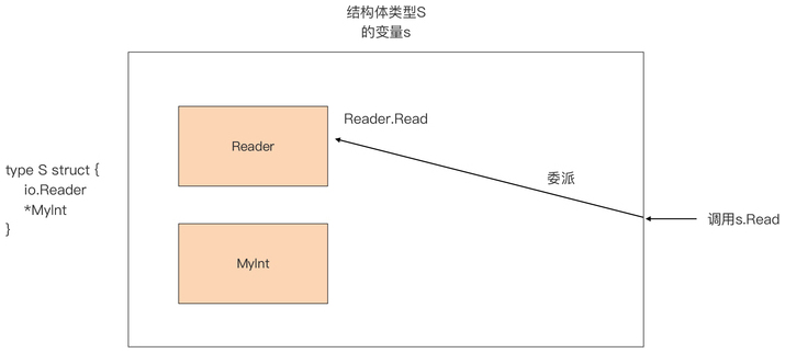 这种“障眼法”的工作机制是这样的,当我们通过结构体类型 S 的变量 s 调用 Read 方法时,Go 发现结构体类型 S 自身并没有定义 Read 方法,于是 Go 会查看 S 的嵌入字段对应的类型是否定义了 Read 方法。这个时候,Reader 字段就被找了出来,之后 s.Read 的调用就被转换为 s.Reader.Read 调用。