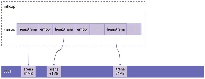 heapArena 管理的内存大小是 64MB,由此可以算出 Go 的整个堆空间最多可以管理 256TB 的大小。