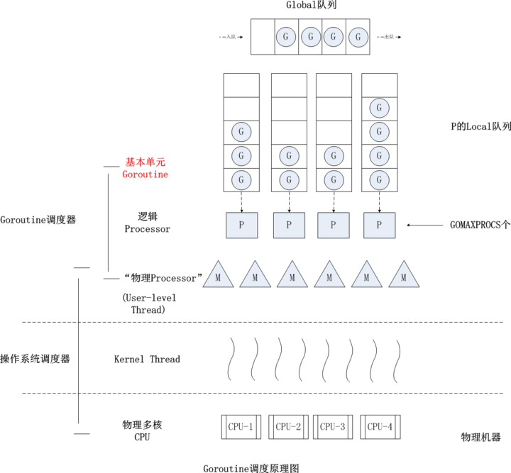 在 Go 1.1 版本中实现了 G-P-M 调度模型和work stealing 算法,这个模型一直沿用至今。模型如下图所示: