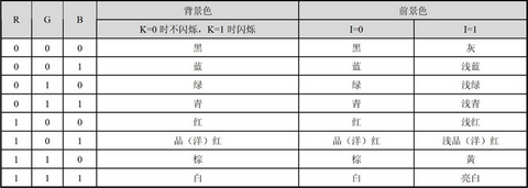 字符的显示属性(1 字节)分为两部分,低4 位定义的是前景色,高4 位定义的是背景色。色彩主要由R、G、B 这3 位决定,可以由红(R)、绿(G)、蓝(B)三原色来配出其他所有颜色。K 是闪烁位,为0 时不闪烁,为1 时闪烁;I 是亮度位,为0时正常亮度,为1 时呈高亮。