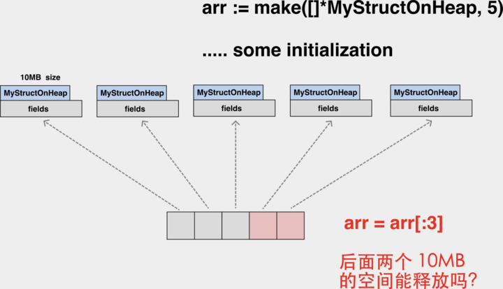 语义垃圾(Semantic Garbage) August 19, 2022 Content # 语义垃圾(semantic garbage),有些场景也被称为内存泄露,指的是从语法上可达(可以通过局部、全局变量被引用)的对象,但从语义上来讲他们是垃圾,垃圾回收器对此无能为力。 我们来看一个语义垃圾在 Go 语言中的实例: 这里,我们初始化了一个 slice,元素均为指针,每个指针都指向了堆上 10MB 大小的一个对象。 当这个 slice 缩容时,底层数组的后两个元素已经无法再访问了,但它关联的堆上内存依然是无法释放的。 Viewpoints # From # 大咖助阵|曹春晖:聊聊 Go 语言的 GC 实现 Links #