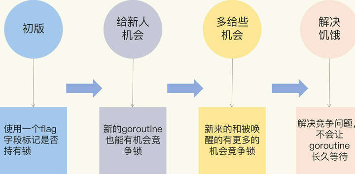 Mutex的架构演进 August 28, 2022 Content # Mutex 的架构演进分成了四个阶段,下面给你画了一张图来说明。 “初版”的 Mutex 使用一个 flag 来表示锁是否被持有,实现比较简单;后来照顾到新来的 goroutine,所以会让新的 goroutine 也尽可能地先获取到锁,这是第二个阶段,我把它叫作“给新人机会”;那么,接下来就是第三阶段“多给些机会”,照顾新来的和被唤醒的 goroutine;但是这样会带来饥饿问题,所以目前又加入了饥饿的解决方案,也就是第四阶段“解决饥饿”。 Viewpoints # From # 02 | Mutex:庖丁解牛看实现 Links #