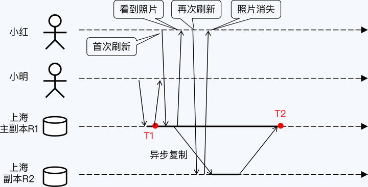 在小明发布照片后的瞬间,小红也刷新了朋友圈,此时读取到副本 R1,所以小红看到了照片;片刻之后,小红再次刷新,此时读取到的副本是 R2,于是照片消失了。小红以为小明删除了照片,但实际上这完全是程序错误造成的,数据向后回滚,出现了“时光倒流”。