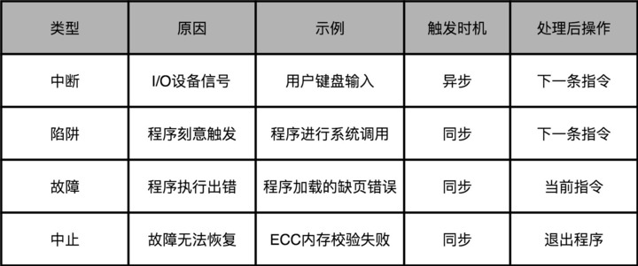 在这四种异常里,中断异常的信号来自系统外部,而不是在程序自己执行的过程中,所以我们称之为“异步”类型的异常。而陷阱、故障以及中止类型的异常,是在程序执行的过程中发生的,所以我们称之为“同步“类型的异常。