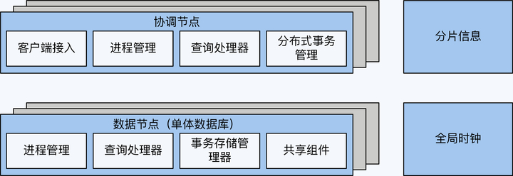 很多分库分表方案会演进到这个阶段,比如 MyCat。这时离分布式数据库还差重要的一步,就是全局时钟。全局时钟是实现数据一致性的必要条件。