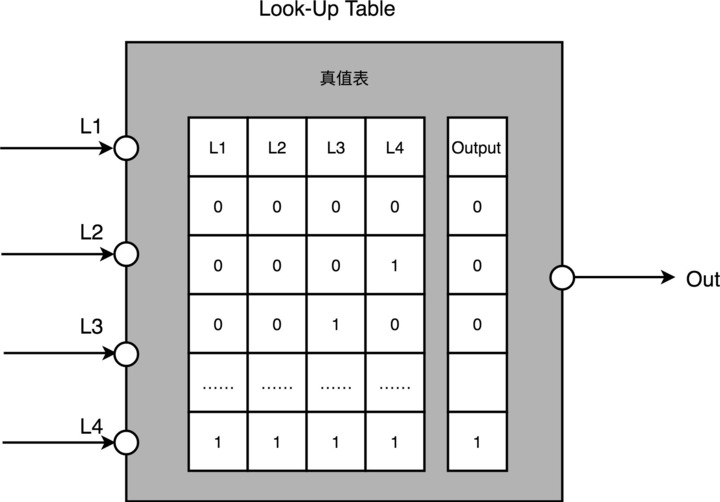 在实现 CPU 的功能的时候,我们需要完成各种各样的电路逻辑。在 FPGA 里,这些基本的电路逻辑,不是采用布线连接的方式进行的,而是预先根据我们在软件里面设计的逻辑电路,算出对应的真值表,然后直接存到一个叫作 LUT(Look-Up Table,查找表)的电路里面。这个 LUT 呢,其实就是一块存储空间,里面存储了“特定的输入信号下,对应输出 0 还是 1”。
