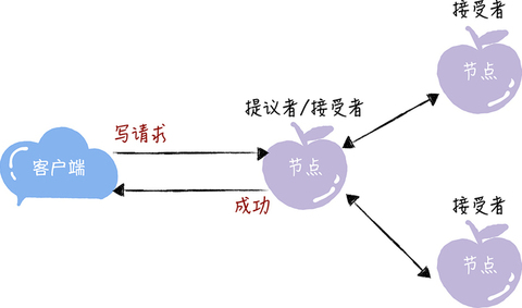 讲到这儿,你可能会有疑惑:前面不是说接收客户端请求的节点是提议者吗?这里怎么又是接受者呢?这是因为一个节点(或进程)可以身兼多个角色。想象一下,一个 3 节点的集群,1 个节点收到了请求,那么该节点将作为提议者发起二阶段提交,然后这个节点和另外 2 个节点一起作为接受者进行共识协商,就像下图的样子: