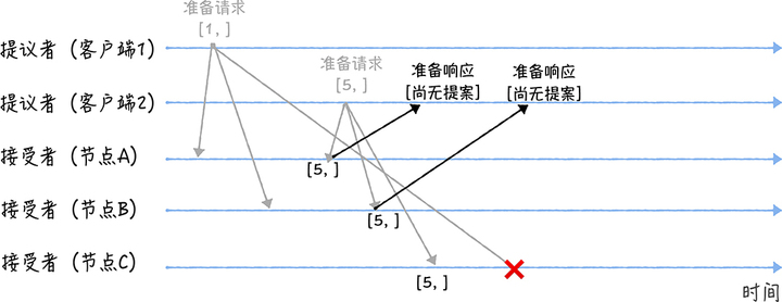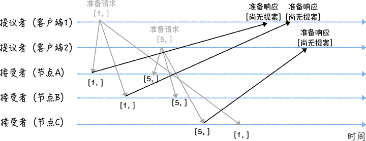 我们假设客户端 1 的提案编号为 1,客户端 2 的提案编号为 5,并假设节点 A、 B 先收到来自客户端 1 的准备请求,节点 C 先收到来自客户端 2 的准备请求。