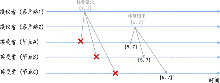 当节点 A、B、C 收到接受请求[1, 3]的时候,由于提案的提案编号 1 小于三个节点承诺能通过的提案的最小提案编号 5,所以提案[1, 3]将被拒绝。