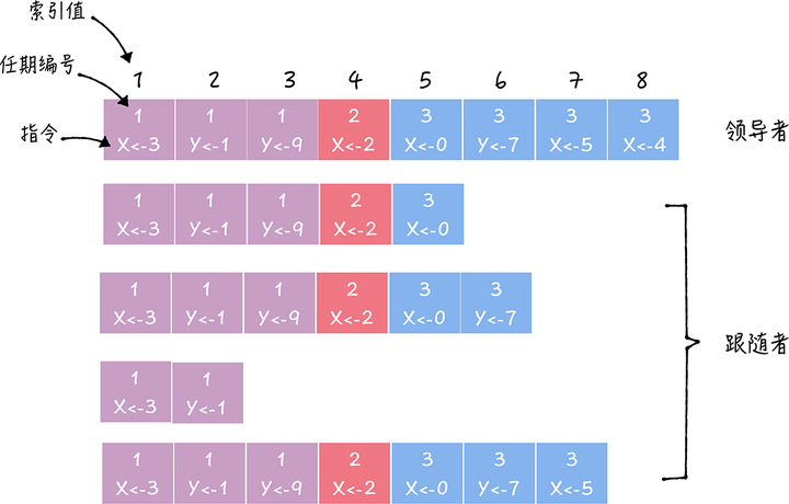 从图中你可以看到,一届领导者任期,往往有多条日志项。而且日志项的索引值是连续的,这一点你需要注意。