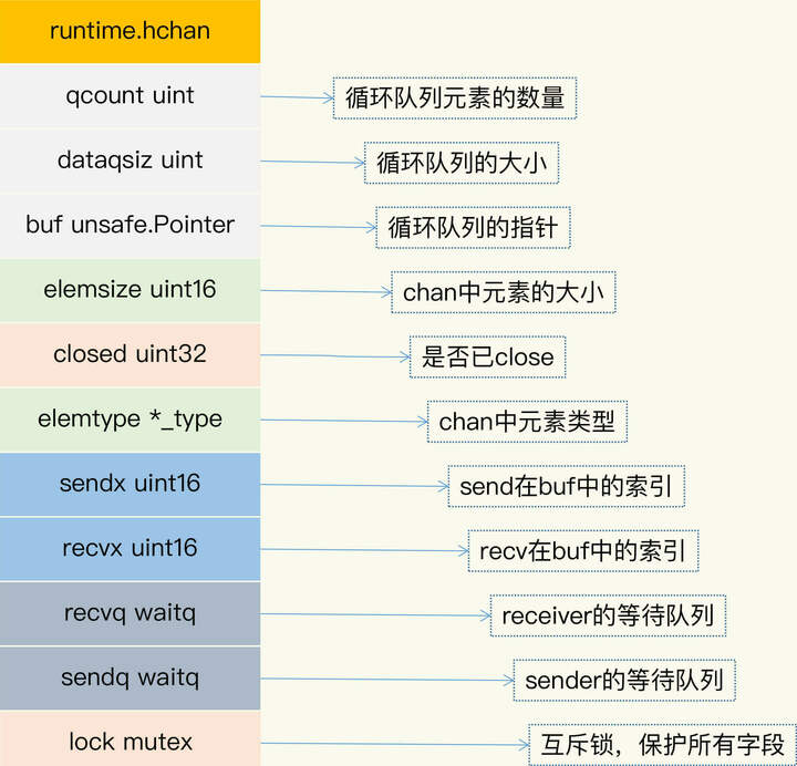 elemtype 和 elemsize:chan 中元素的类型和 size。因为 chan 一旦声明,它的元素类型是固定的,即普通类型或者指针类型,所以元素大小也是固定的。