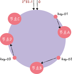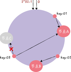key-01 和 key-02 不会受到影响,只有 key-03 的寻址被重定位到 A。一般来说,在一致哈希算法中,如果某个节点宕机不可用了,那么受影响的数据仅仅是,会寻址到此节点和前一节点之间的数据。比如当节点 C 宕机了,受影响的数据是会寻址到节点 B 和节点 C 之间的数据(例如 key-03),寻址到其他哈希环空间的数据(例如 key-01),不会受到影响。