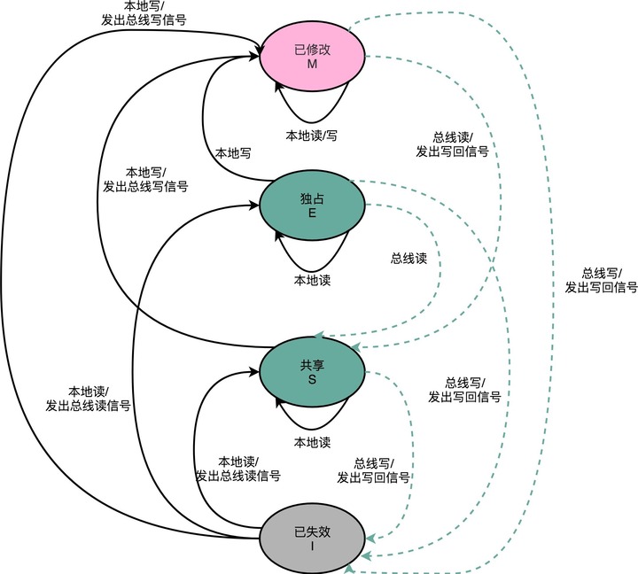 整个 MESI 的状态,可以用一个有限状态机来表示它的状态流转。需要注意的是,对于不同状态触发的事件操作,可能来自于当前 CPU 核心,也可能来自总线里其他 CPU 核心广播出来的信号。
