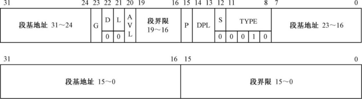 LDT 本身也是一种特殊的段,最大尺寸是64KB。段基地址指示LDT 在内存中的起始地址,段界限指示LDT 的范围;描述符的G 位是粒度位,适用于LDT 描述符,以表示LDT 的界限值是以字节为单位,还是以4KB 为单位。即使是以4KB 为单位,它也不能超过64KB 的大小。 D 位(或者叫B 位)和L 位对LDT 描述符来说没有意义,固定为0。 AVL 和P 位的含义和存储器的段描述符相同。 LDT 描述符中的S 位固定为0,表示系统的段描述符或者门描述符,以相对于存储器的段描述符(S=1),因为LDT 描述符属于系统的段描述符。