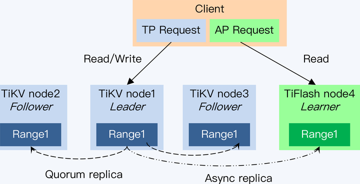 如果底层存储是一份数据,那么天然就可以保证 OLTP 和 OLAP 的数据一致性,这是 PAX 的最大优势,但是由于访问模式不同,性能的相互影响似乎也是无法避免,只能尽力选择一个平衡点。TiDB 展现了一种不同的思路,介于 PAX 和传统 OLAP 体系之间,那就是 OLTP 和 OLAP 采用不同的存储方式,物理上是分离的,然后通过创新性的复制策略,保证两者的数据一致性。