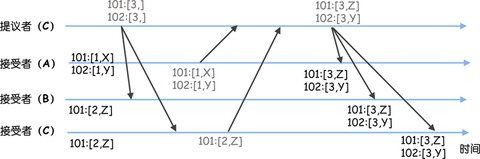 假设这时节点 B 故障了,节点 A 恢复了,选举出领导者 C 后,节点 B 故障也恢复了。节点 C 当选领导者后,需要先作为学习者了解目前已被选定的指令,这时它执行 Basic Paxos 的准备阶段,就会发现之前选定的值(比如 Z、Y),然后发送接受请求,最终在序号 101、102 处达成共识的指令是 Z、Y。就像下图的样子。