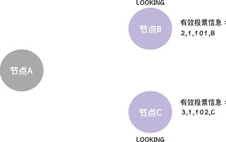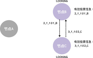 接着节点 B、C 分别接收到来自对方的选票,比如 B 接收到来自 C 的选票,C 接收到来自 B 的选票: