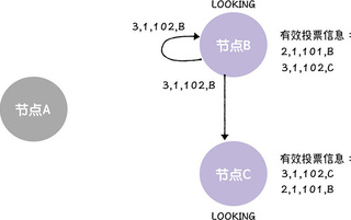 接着,当节点 B、C 接收到来自节点 B,新的选票时,因为这张选票(<3, 1, 102, B>)提议的领导者,与他们提议的领导者是一样的,都是节点 C,所以,他们正常接收和存储这张选票,就可以。