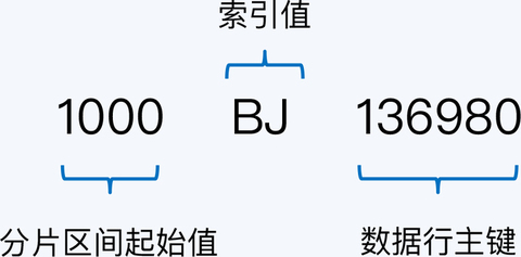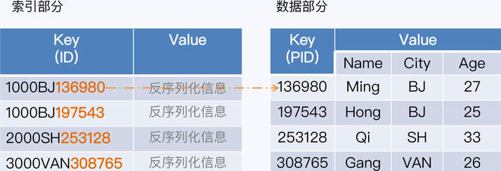 我们在“City”字段上建立索引,索引与数据行是一对一的关系(建立索引时所用的主键会生成下图所示的Key,会加上其他信息,不是只有City的值)。索引存储也是 KV 形式,Key 是索引自身的主键 ID,Value 是反序列化信息用于解析主键内容。索引主键由三部分构成,分别是分片区间起始值、索引值和所指向数据行的主键(PID)。因为 PID 是唯一的,索引主键在它的基础上增加了前缀,所以也必然是唯一的。