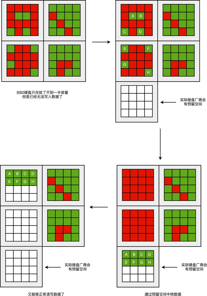 一块标成 240G 的 SSD 硬盘,往往实际有 256G 的硬盘空间。SSD 硬盘通过我们的控制芯片电路,把多出来的硬盘空间,用来进行各种数据的闪转腾挪,让你能够写满那 240G 的空间。这个多出来的 16G 空间,叫作预留空间(Over Provisioning),一般 SSD 的硬盘的预留空间都在 7%-15% 左右。